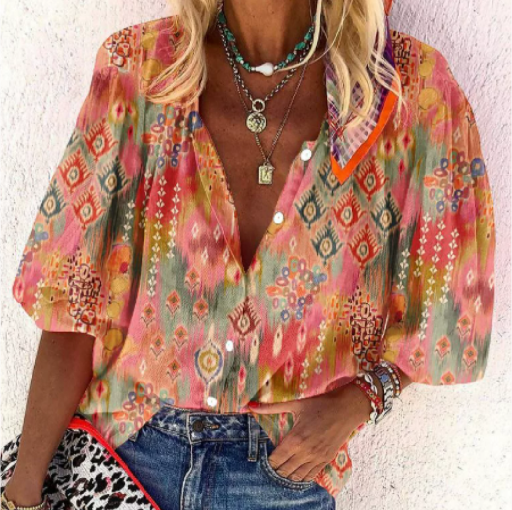 Die Damenbluse hat einen V-Ausschnitt und kurze Ärmel. Die Vorderseite ist mit einer Knopfleiste ausgestattet. Die Oberfläche zeigt ein bedrucktes Muster. Die Nähte sind gleichmäßig verarbeitet. Die Silhouette ist gerade geschnitten.